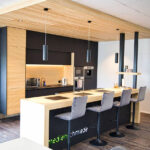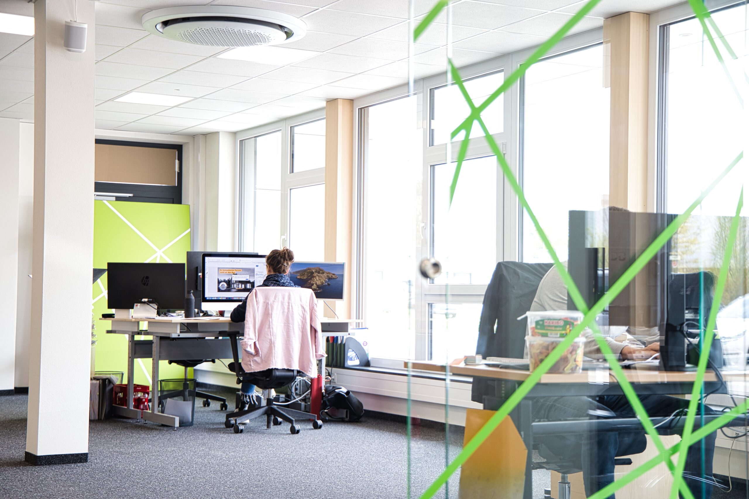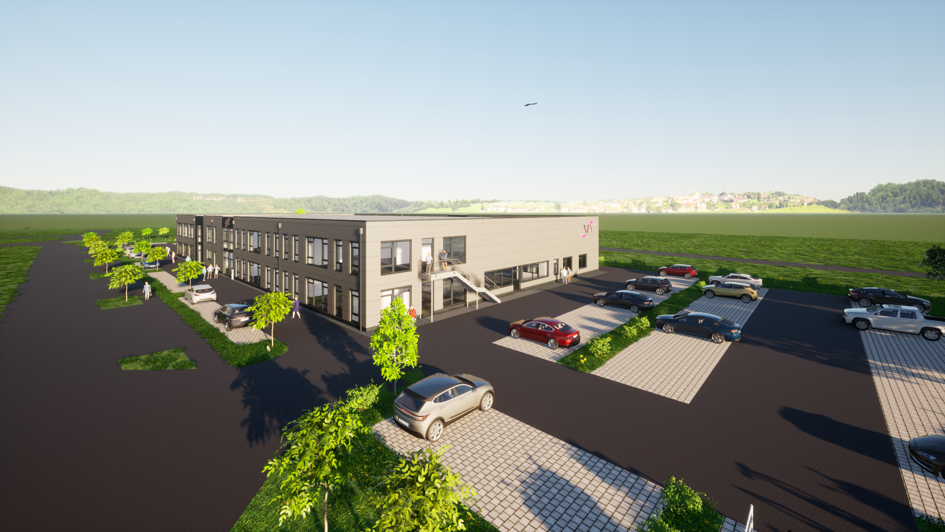 Ergebnis: Auf einem Grundstück von knapp 10.000 qm entsteht ein Gebäude mit einer Gesamtfläche von über 3.000 qm. Aufgeteilt in 1.715 qm Fertigungs- und Lagerbereich und 1.350 qm Büro- und Mitarbeiterbereich. Klimatisierte Serverräume, ein cleveres Luftwärmepumpen-Konzept und eine Wasserentkalkungsanlage für hochwertiges Trinkwasser sind nur drei der vielen Highlights. Die Sichtverbindung ist in den modernen Büroräumen entstanden. Das gesamte Gebäude ist barrierefrei und bietet eine Vielzahl an Parkplätzen. Im Erdgeschoss wurde ein Bistro samt Sonnenterasse mit konzipiert.