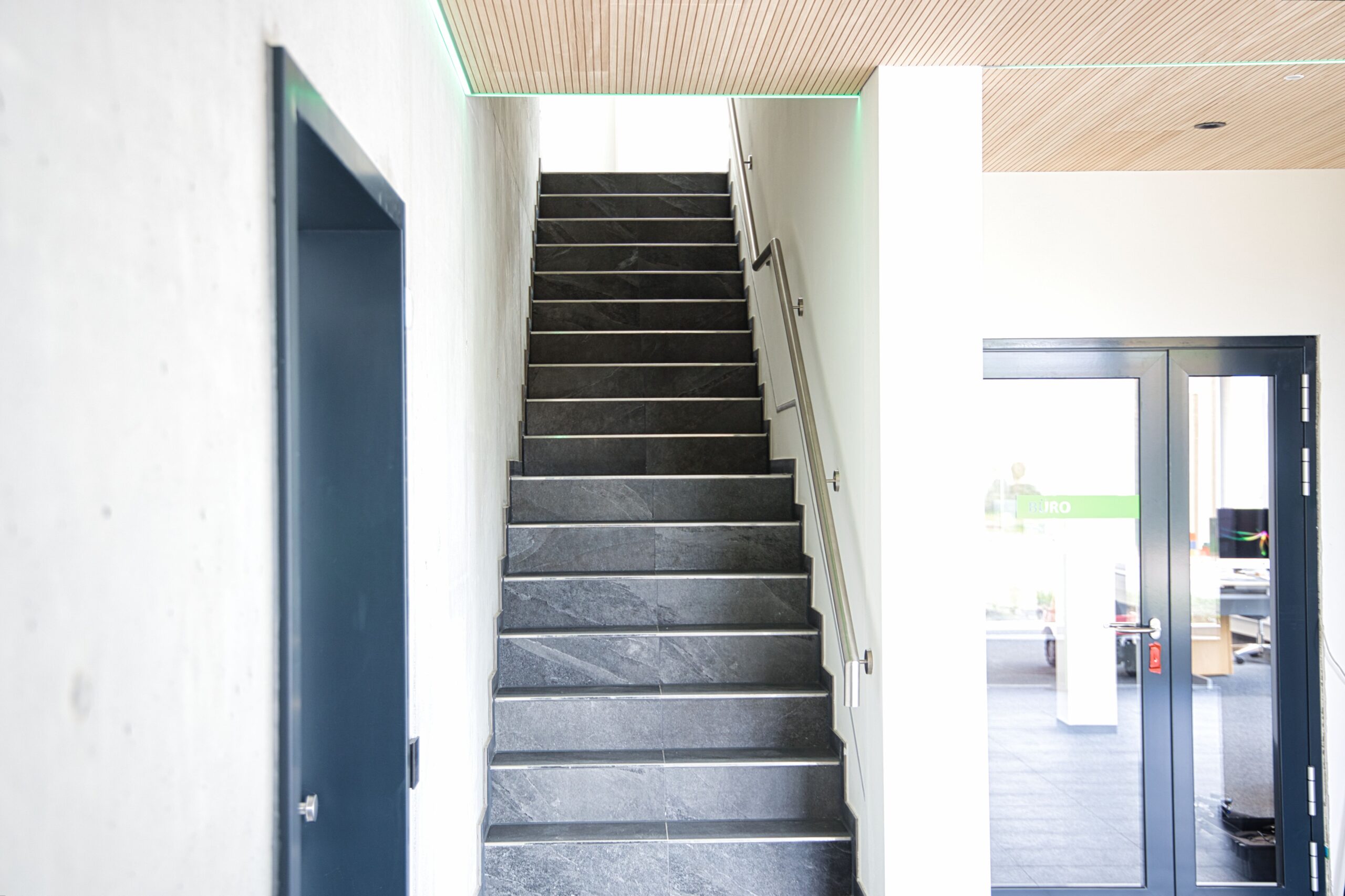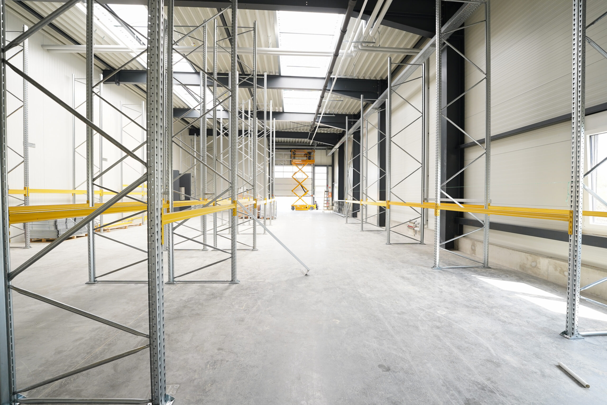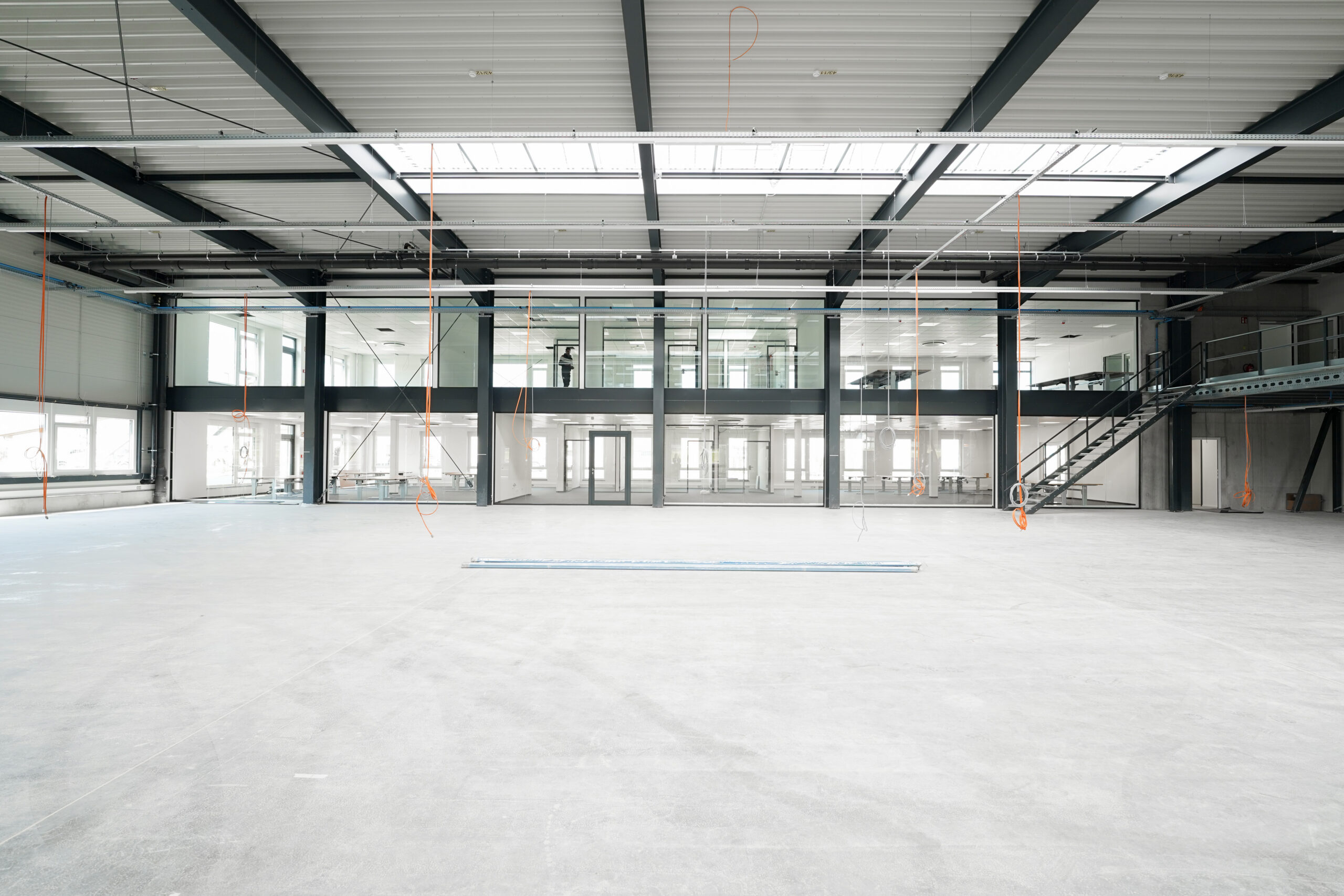 Ergebnis: Auf einer Fläche von 4.291 qm entstand ein moderner, nachhaltiger und hochfunktionaler Neubau. Die Produktions- und Lagerhalle bietet verteilt auf zwei Etagen ausreichend Raum für alle Arbeitsbereiche des Unternehmens, welche durch Rolltore voneinander separiert werden können. Es wurde so konzipiert, dass jederzeit ein Anbau möglich ist. Das Gebäude entspricht KfW 55 Standards und ist somit energieeffizient. Das integrierte Sicherheitssystem sichert alle Türen durchgängig vom Verwaltungszentrum beginnend bis zur Produktionshalle.